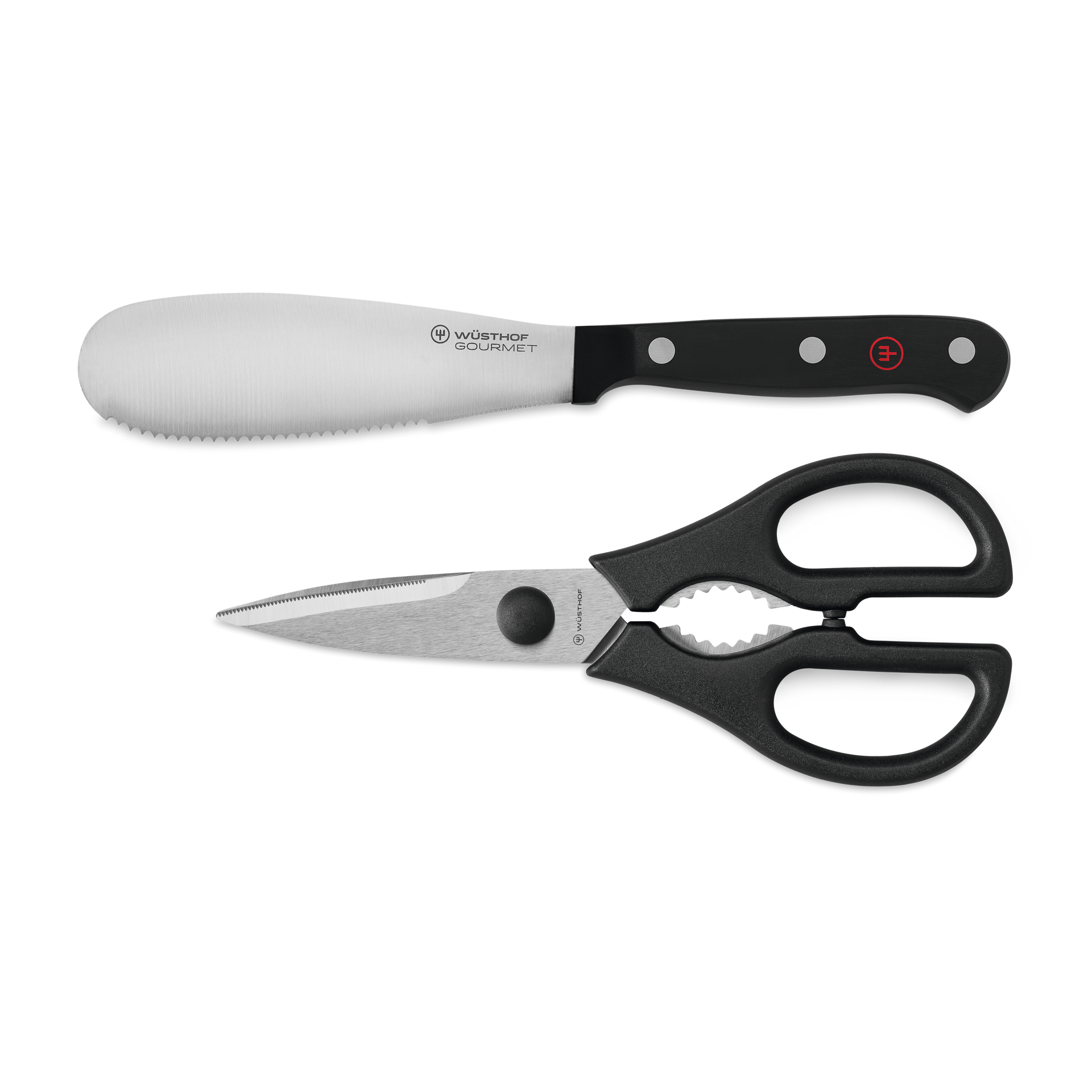 Two essential tools for any kitchen. The WÜSTHOF Gourmet 2-Piece Spreader and Shear Set includes one Gourmet 5" Spreader and one pair of WÜSTHOF Come-Apart Kitchen Shears in Black.