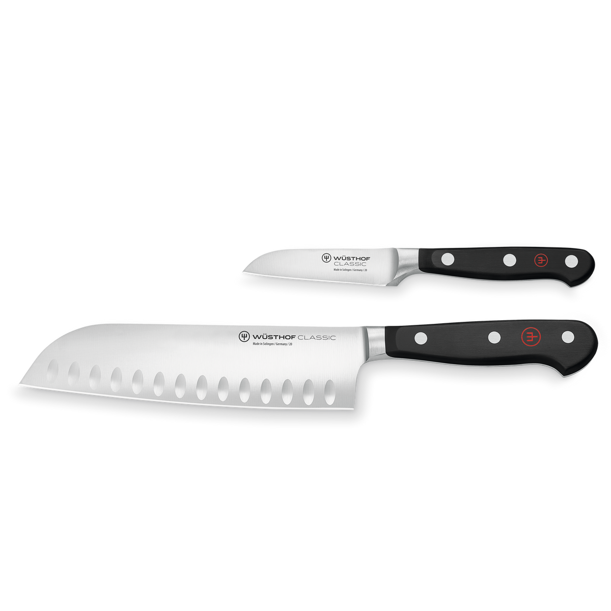 Inspired by traditional, Japanese-style knife artisanship, the WÜSTHOF Classic 2-Piece Asian Cook's Set is the perfect starter set for home cooks and professional chefs. The Classic 7" Hollow Edge Santoku chef's knife is just right for finely chopping produce, herbs, and meat — and its sharp, scalloped edge creates tiny air pockets during slicing to prevent food from sticking to the blade. Meanwhile, the Classic 3" Flat Cut Paring Knife, offers precise control for decorating, peeling, mincing, and dicing.