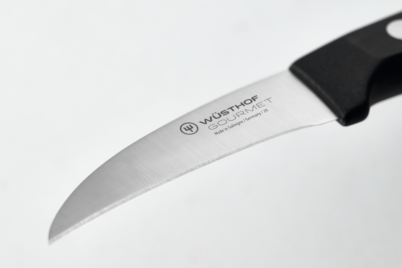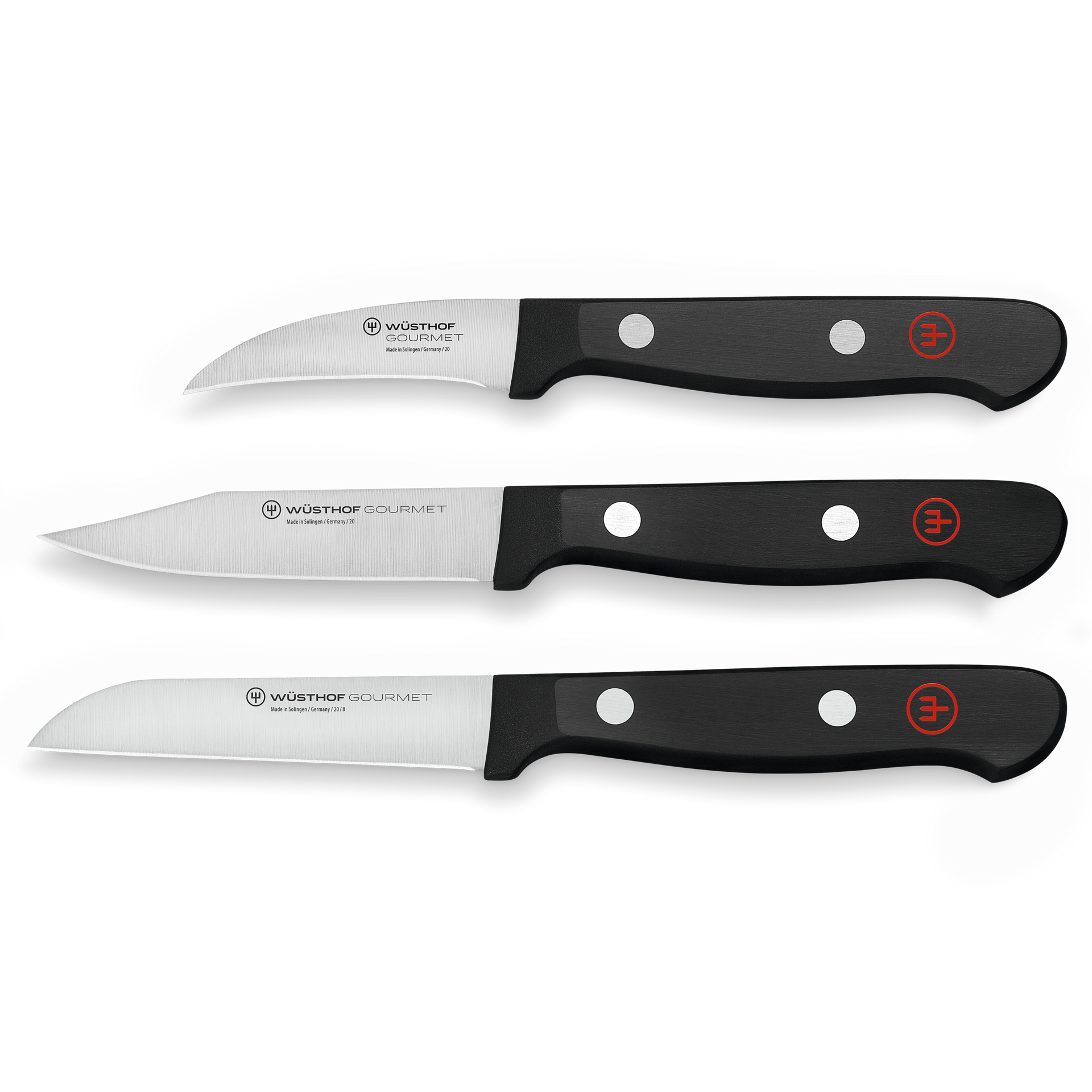 The Gourmet 3-Piece Paring Knife set includes one Gourmet Peeling Knife, one Gourmet 3" Clip Point Paring Knife, and one Gourmet 3" Flat Cut Paring Knife.